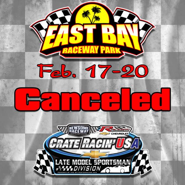 ADAIRSVILLE, Ga. — The inaugural appearance of the Crate Racin’ USA 602 Late Model Sportsman division scheduled Feb. 18-20 as part of the traditional Florida Winternationals at East Bay Raceway Park in Gibsonton, Fla., has been canceled due to recent inclement weather, and a prediction for more rain through the coming weekend.